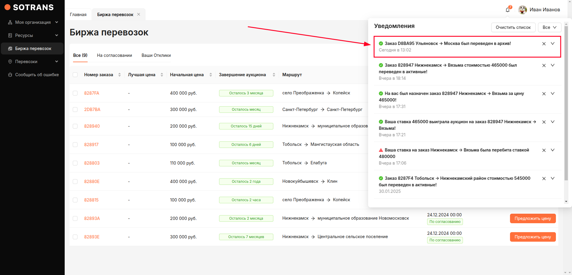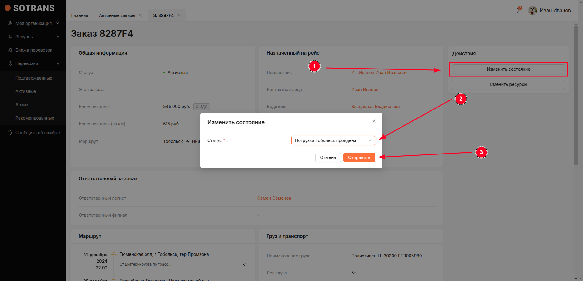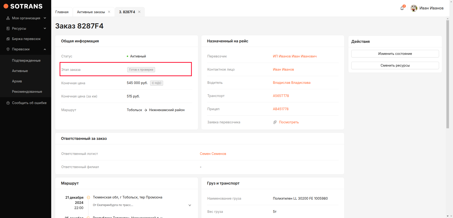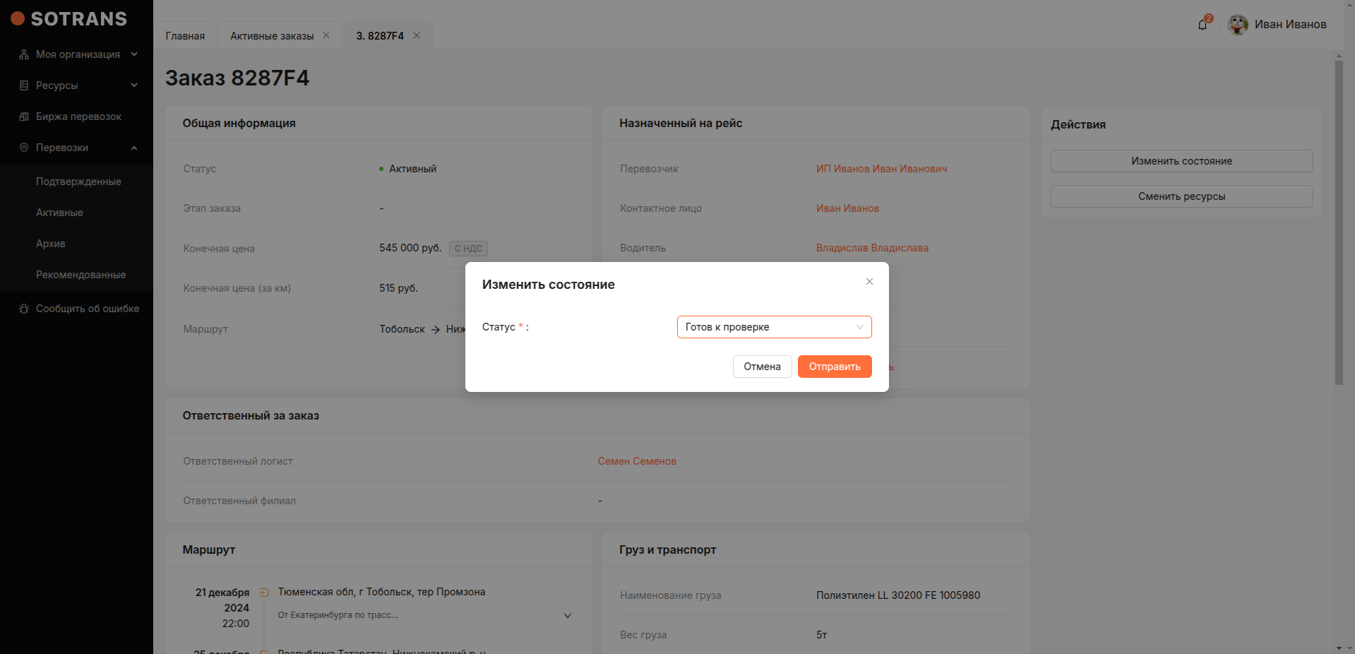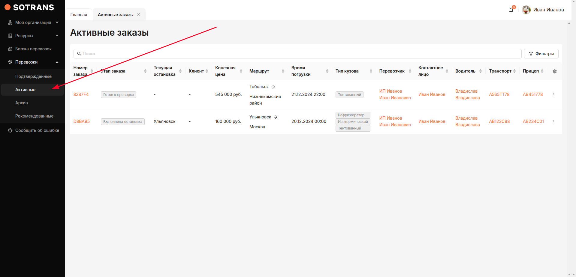 После подтверждения Заказа, он переместится в раздел "Перевозки" --> "Активные"