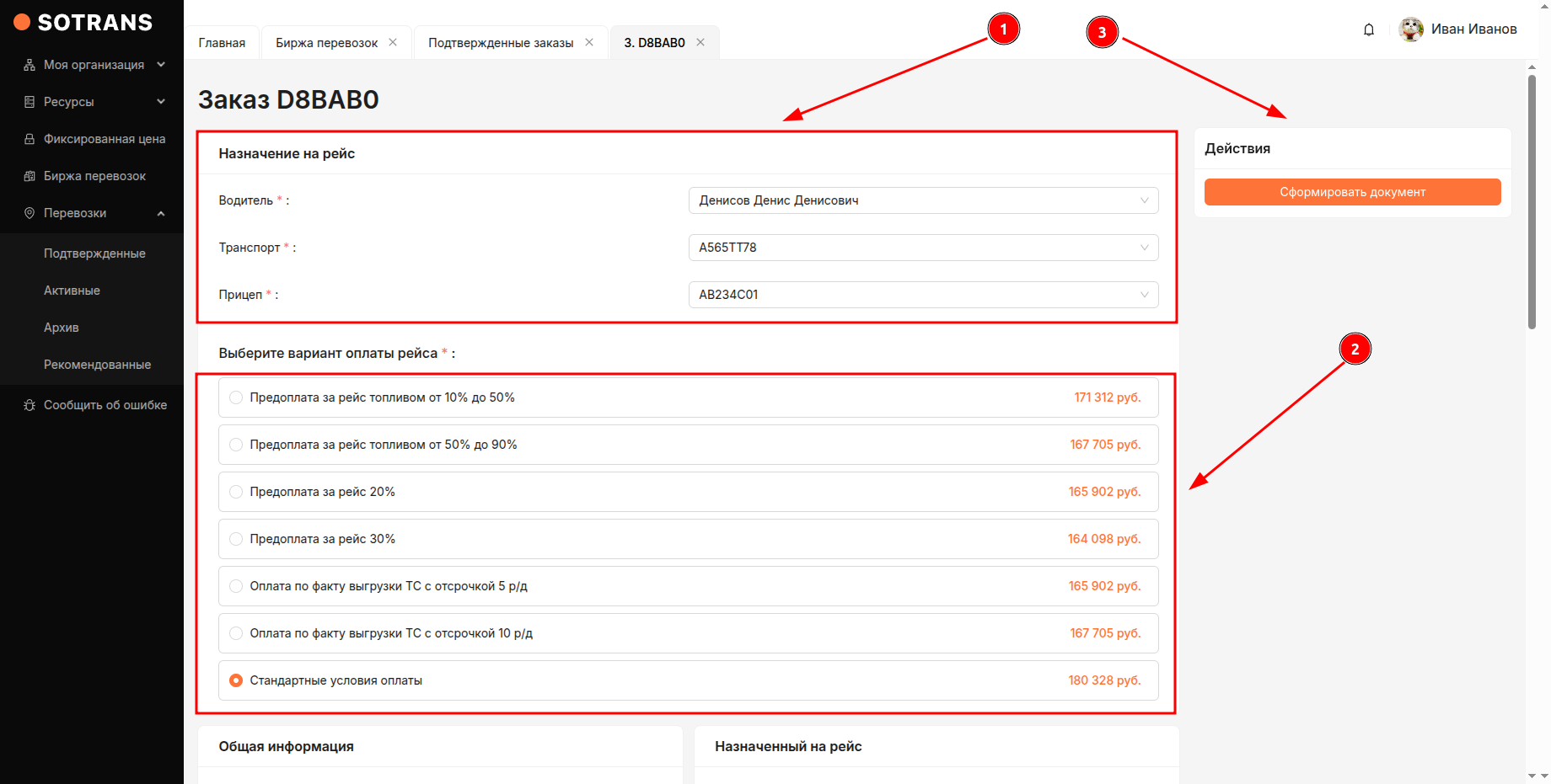 назначить водителя и транспорт на Заказ (1), выбрать способ оплаты (2) и нажать на кнопку Сформировать документ (3).